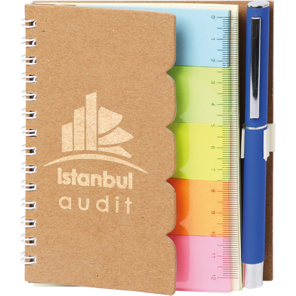 * Kağıt: 55 Yaprak * 70 gr. Krem * Sert Kapak * Baskı: Serigrafi, Dijital * Spiralli * Kalem Tutucu * Geri Dönüşüm Kağıt * Yapışkanlı Notluklar * 12 cm Cetvel * Kalem aksesuardır.